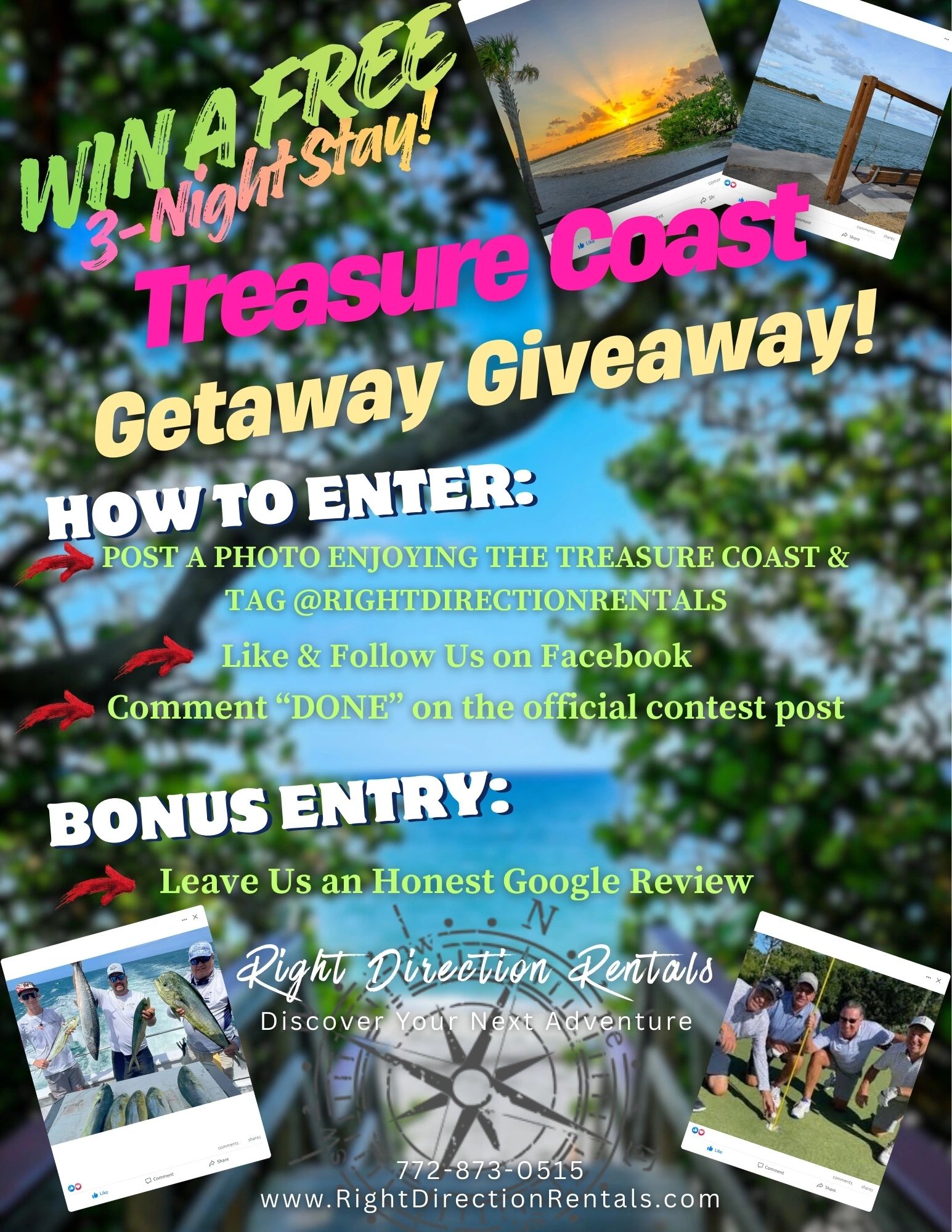 One (1) FREE long-weekend stay (3 nights) at any available Right Direction Rentals vacation unit on the Treasure Coast (winner chooses location, subject to availability and blackout dates).